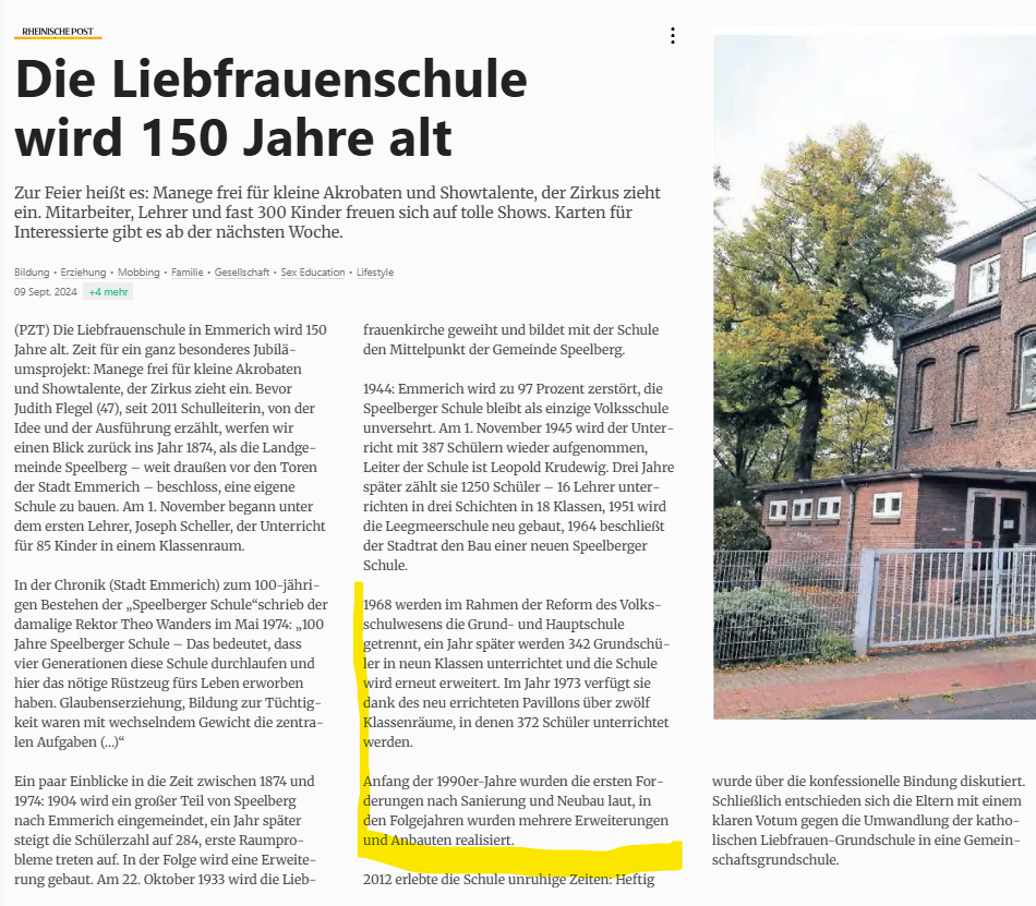 Wir befinden uns in der Nähe der Allgemeinbildenden Schule in Emmerich am Rhein, genauer gesagt an der Liebfrauenschule. Dieser altehrwürdige Klinkerbau feierte im Jahr 2024 sein 150-jähriges Bestehen und mit ihr sicherlich auch Teile der Abwasserkanäle, was dann die hohen Nitratwerte als den gemessenen Wert an Süßstoff im Grundwasser erklärt (Link 1 – hier klicken). Mit der Sanierung (Link 2 – hier klicken) (Bild 1 – hier klicken) der Schule (und damit sicherlich auch Teile der Abwasserleitungen) halbierten sich jetzt die Nitratwerte an der Messstelle (Link 3 – hier klicken).