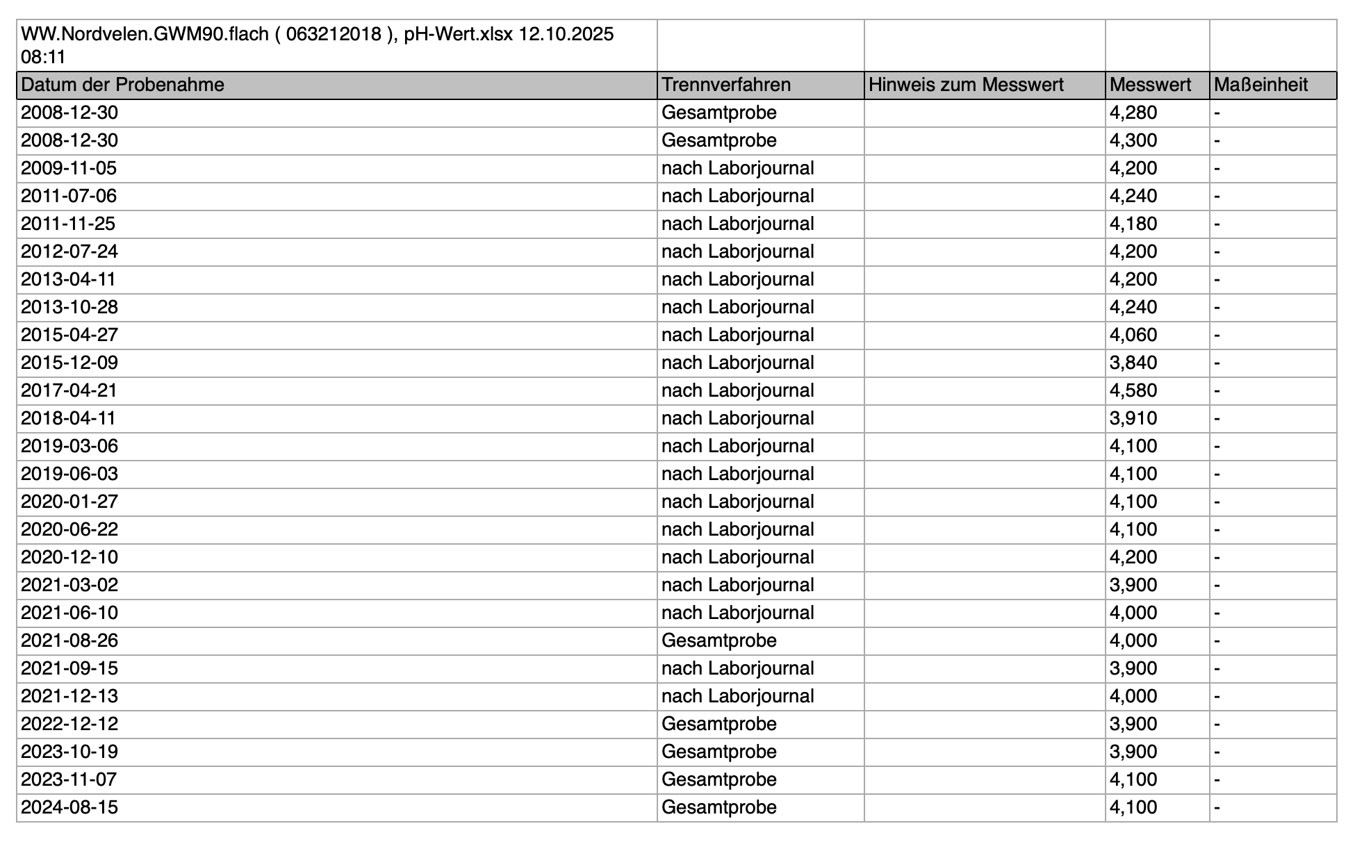 Augenscheinlich haben die Probenehmer die Messwerte von der doppelten Messstelle permanent vertauscht, was zu diesen Werteschwankungen geführt hat. Der Einfachheit halber finden wir nur noch eine Messstelle in der ELWAS-Datenbank wieder, was hier zu neuen Vermutungen führt: